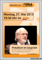 Am 27. Mai 2013 um 19:30 Uhr ist KIT-Präsident Prof. Umbach im Z10 zu Gast um Fragen der Studierenden zu beantworten.