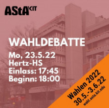 Am Montag den 23.05.2022 wird um 18:00 Uhr im Hertz-Hörsaal (Gebäude 10.11) eine Wahldebatte zu den Wahlen des Studierendenparlaments stattfinden. Dabei stellen sich die antretenden Listen vor und diskutieren über ihre Ansichten zu ausgewählten Themen rund um die Positionen der Verfassten Studierendenschaft. Außerdem wird ausreichend Zeit vorgesehen sein, in der ihr eure eigenen Fragen an die antretenden Listen und Kandidierenden stellen könnt - um damit letztlich zukünftige Abgeordnete auf eure Interessen und Bedürfnisse als Studierende aufmerksam zu machen.