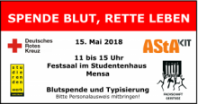 Der AStA bedankt sich ganz herzlich bei allen Helfern, insbesondere auch bei der Fachschaft GeistSoz und dem DRK. Der AStA führt seit 2015 Blutspendeaktionen in Kooperation mit dem DRK durch, meist zusammen mit einer anderen studentischen Gruppe. Interessierte Gruppen dürfen sich gern jederzeit beim AStA melden.