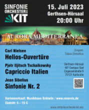 Am Samstag, den 15.07.2023 spielt das Sinfonieorchester des KIT um 20 Uhr im (klimatisierten) Gerthsen-Saal des KIT in Karlsruhe unter dem Titel "Aurora Mediterranea" 3 Werke von aus dem Norden stammenden Komponisten, die ihren Ursprung bei Mittelmeerreisen fanden.