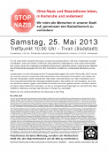 Am 25. Mai 2013 wollen hunderte Neonazis in Karlsruhe unter dem Motto "Freiheit für alle politischen Gefangenen! Lasst unsere Kameraden frei" marschieren. Startpunkt des Neonaziaufmarsches ist vermutlich der Vorplatz des Hauptbahnhofs. Diese Demonstration wird von Seiten der Neonazis als "Nationale Großdemonstration" beworben. Gerade in Hinblick auf den NSU-Prozeß ist es notwendig als Demokrat_innen diesem Neonaziaufmarsch entgegenzutreten.