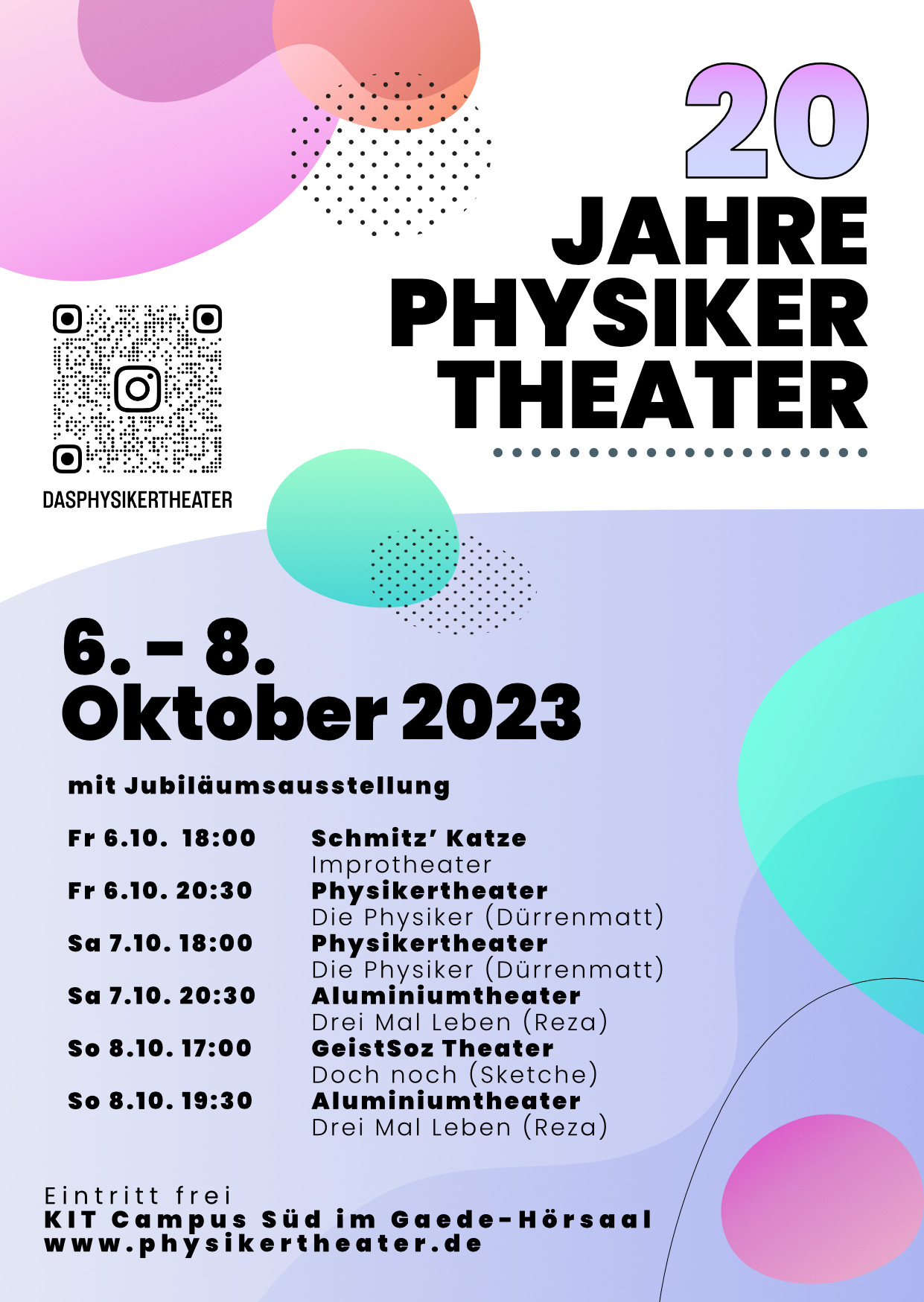 Am Wochenende vom 06.10. bis 08.10.23 zelebriert das Physikertheater stolz sein 20-jähriges Bestehen im festlichen Ambiente des Gaede-Hörsaals am KIT. In diesem feierlichen Rahmen möchten wir herzlich zu einem außergewöhnlichen Theatererlebnis einladen, das sechs Aufführungen von insgesamt vier verschiedenen Theatergruppen umfasst. Unser vielfältiges Programm verspricht spannende Theaterstücke, unterhaltsame Sketche und mitreißendes Improtheater.