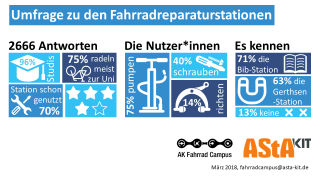 Im März 2018 haben wir eine Umfrage zu den Fahrradreparaturstationen am Campus durchgeführt die wir Anfang letztes Jahr aufgestellt haben. Als AK Fahrrad Campus wollten wir sehe, was ihr von den Stationen haltet und was wir noch besser machen können. An der Umfrage haben 2.666 Personen teilgenommen, ca. 96% davon Studis und der Rest Mitarbeiter*innen des KIT.