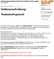 Der AStA sucht ab Juni zwei neue Thekenkräfte. Du solltest kommunikativ, engagiert und pünktlich sein. Grundkenntnisse in Englisch und ein Studium an einer Karlsruher Hochschule werden vorausgesetzt.