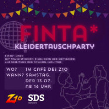 Am Samstag des 13.07. findet im Z10 der FINTA*-only Kleidertausch Abend statt. Wir werden einen feministischen Blick auf die Fashion-Infustrie werfen und gemeinsam diskutieren. Bringt eure Freund:innen mit und lasst uns gemeinsam einen schönen Abend haben!