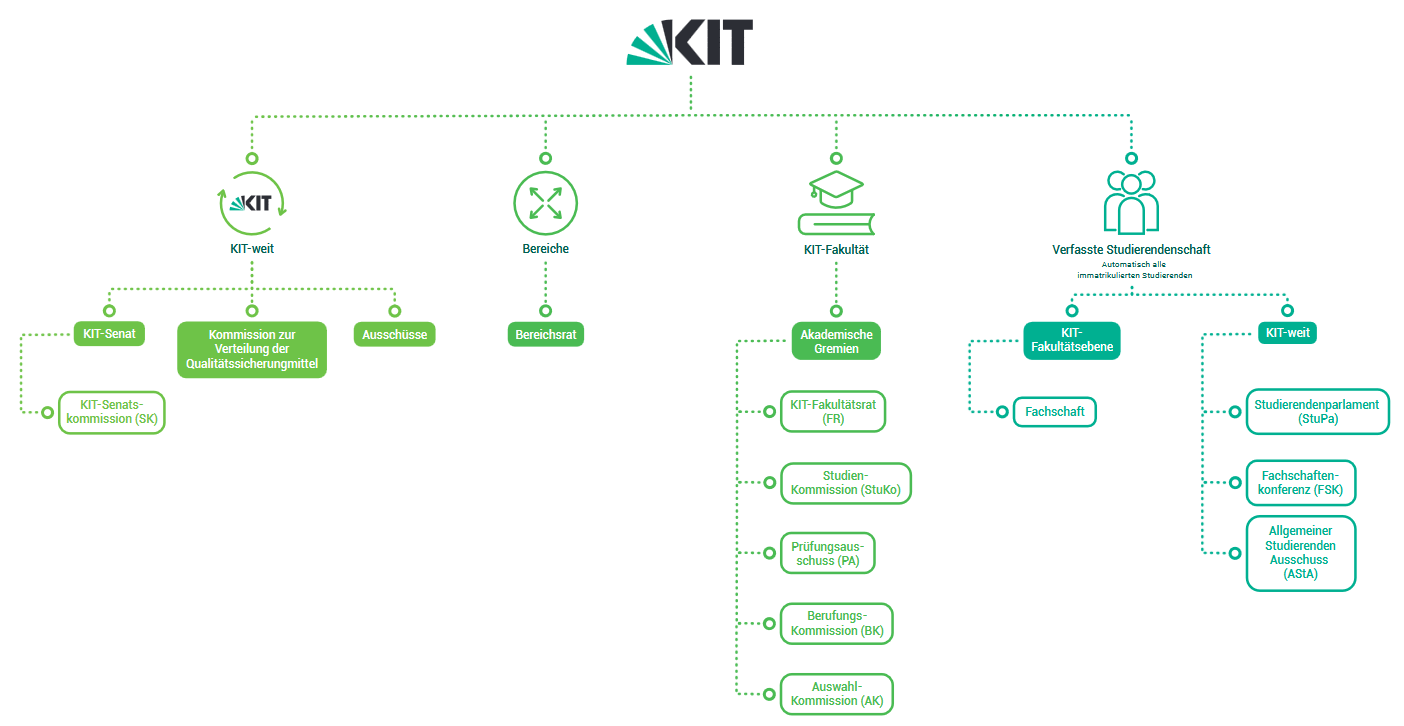 Aus der Studierendenschaft werden Vertreter in verschiedene Gremien des KIT und des Stuwe (Studierendenwerk) entsandt. Sie setzen sich direkt in den Strukturen für des KIT und des Studierendenwerkes für die Studis ein (Themen sind beispielsweise Chancengleichheit, bessere Lehre, nachhaltigere Infrastruktur, etc.). Unter diesem Punkt findet ihr einen Überblick.